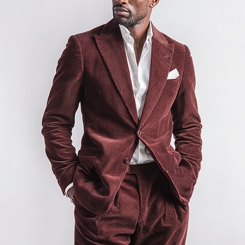 Uomo Casuale Feste Abito in velluto a coste Bavero classico Nero Borgogna Festa Casual Tinta unita Vestibilità su misura 2 pezzi Monopetto Due Bottoni
