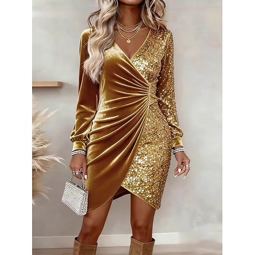 Capodanno Per donna Mini Abito Tubino Elegante Festa Compleanno Vacanza Feste Matrimonio Tinta unica Manica Lunga Scollo a V Rosso bordeaux Nero Oro Inverno