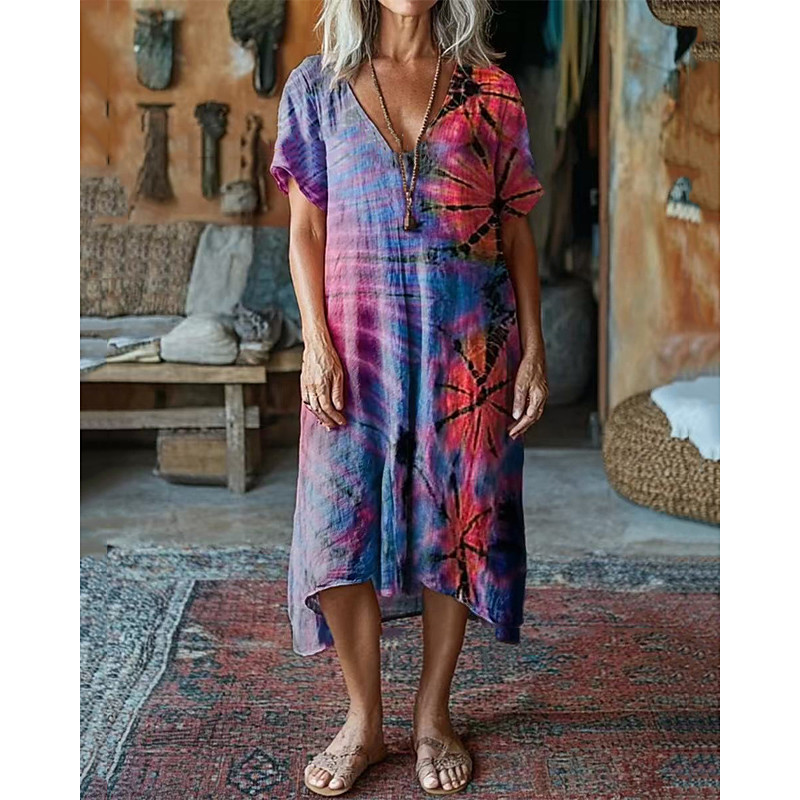 Women's Midi Dress Casual Dress Cotton Linen Dress Summer Dress Boho Dress Fashion Modern Daily Beach Weekend Regular Fit Tie Dye Short Sleeve V Neck Blue Summer
