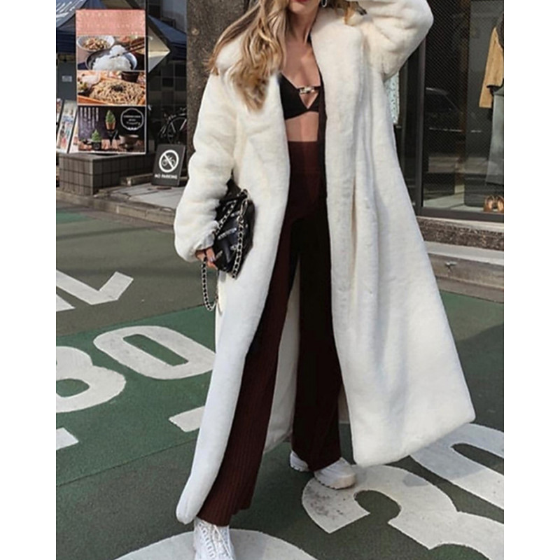 Women's Coat Faux Fur Coat Warm Comfortable Tie Front Active Casual Plain Vacation Holiday Daily Wear Going out Long Turndown Regular Fit Long Sleeve Outerwear Black White Fall Winter