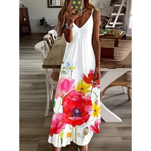 Per donna Abito maxi Vestito Estivo Abito a trapezio Abito Sottoveste Vacanza Casual Boho Spiaggia Vestibilità regolare Floreale Grafico Senza Maniche Scollo a V Bianco Estate Primavera