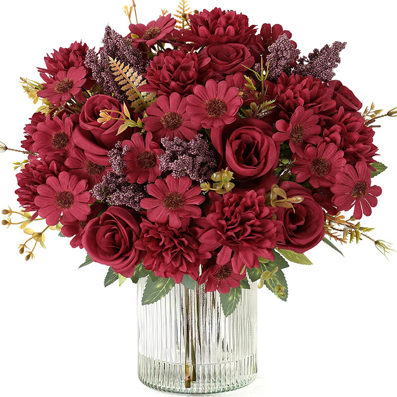 2Pcs 13in/33cm Artificial Flowers Like Real Artificial Bouquet Silk Artificial Roses Bouquet with Daisy Chrysanthemum Pink Flowers for Centerpiece Table Wedding Party Home Decor(red)