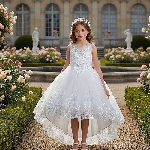 Abito da damigella d'onore bambina Ragazze Abito formale Abiti da sposa Feste Matrimonio Formale Adorabile Principessa Bello Abito per la Prima Comunione Patchwork Rete Floreale Senza Maniche