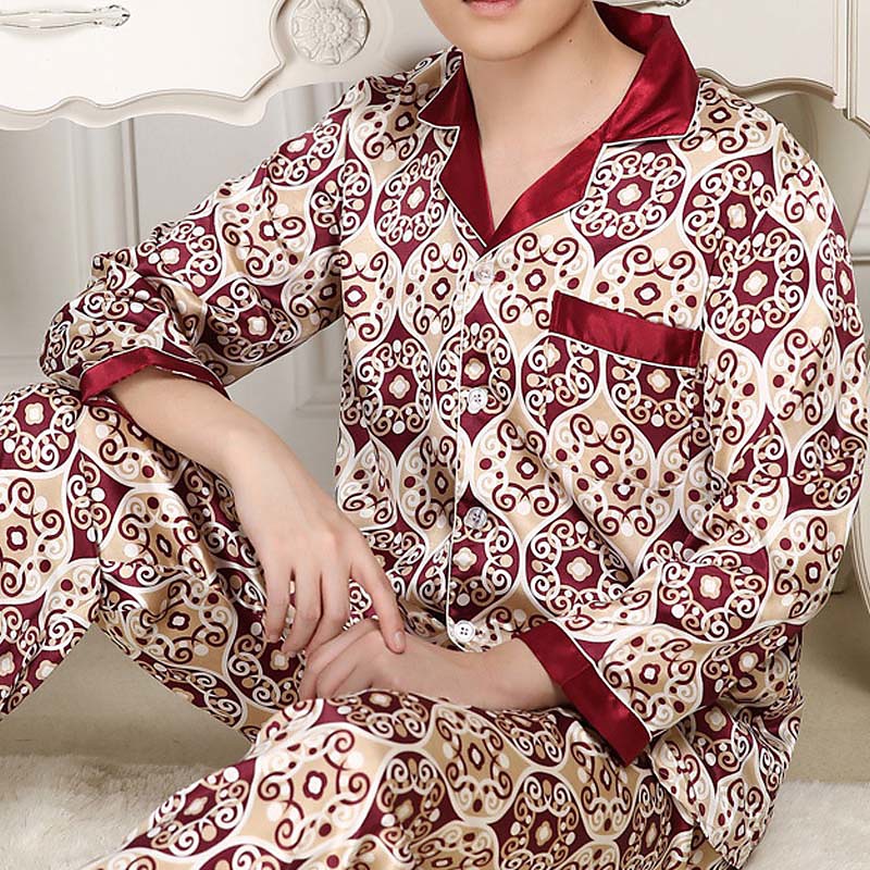Men's Sleepwear Pajama Top and Pant Silk Pajama 2 Pieces Graphic Prints Simple Comfort Home Daily Faux Silk Breathable Lapel Long Sleeve Pant Pocket Summer Spring Champagne Wine
