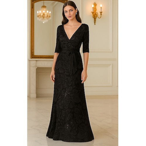 Linea ad A Lunghezza al pavimento Perline ricamate Abito Formale Abito da madre della sposa Abito da Sera Da principessa Abito formale Elegante Scintillante Manica 3/4 Scollo a V Matrimonio Formale