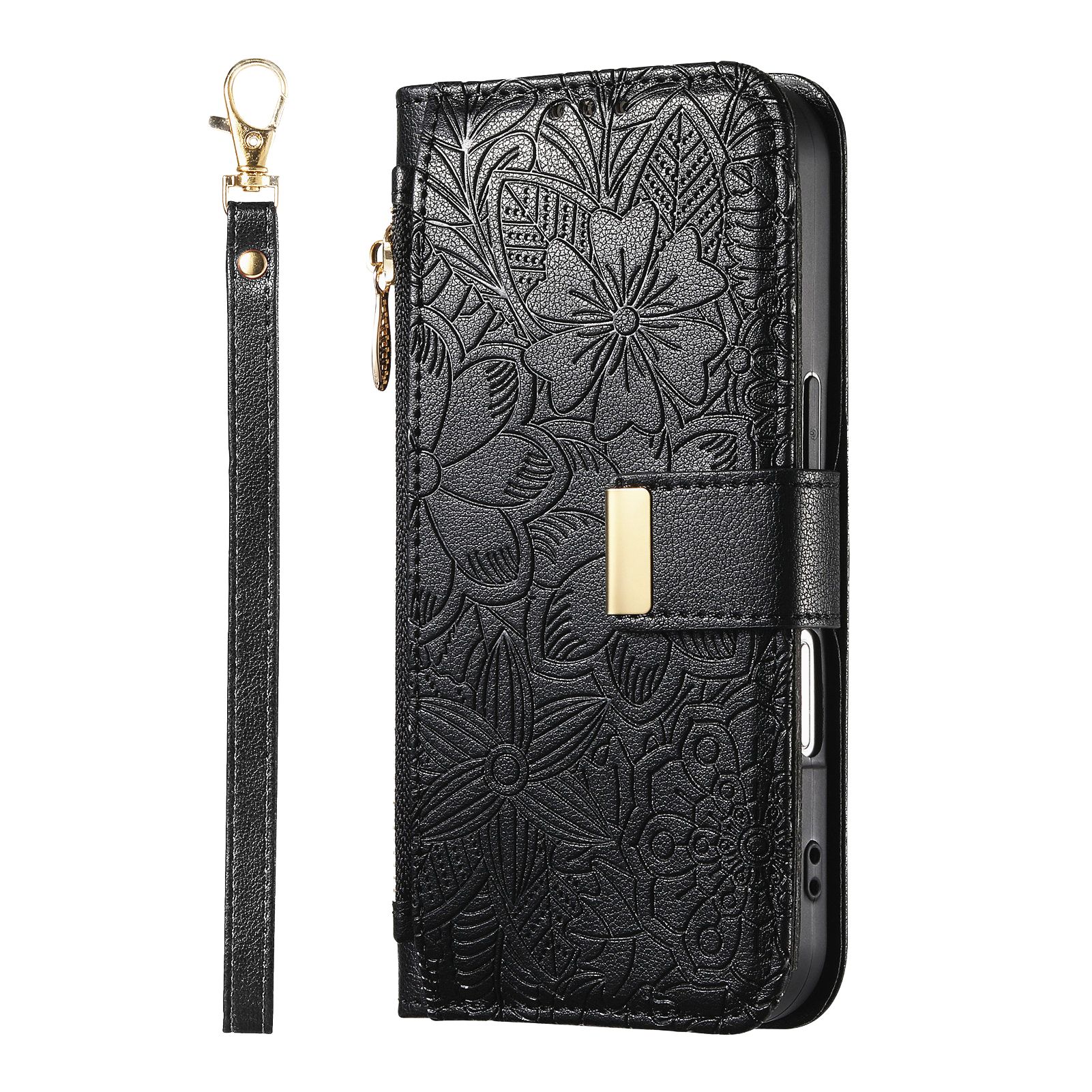 Trolsk Lommebokdeksel med Blomster (iPhone 15 Plus/14 Plus) - Svart - läderimitation, 6 kort, sedelficka, dragkedja, stativ, handledsrem, skydd, svart, lila