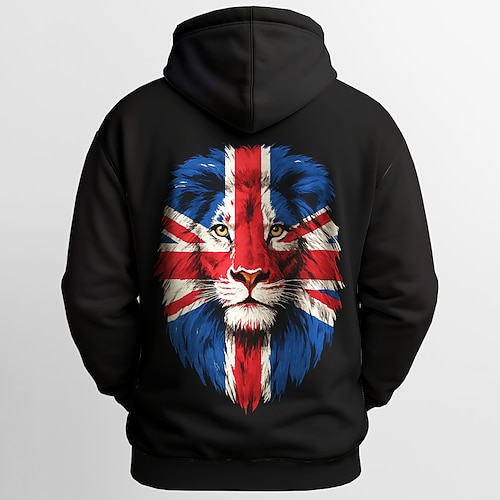 Herren Flagge Löwe UK Kapuzensweatshirt Pullover Sport Mode Rundhalsausschnitt Outdoor Büro Streetwear Schwarz Weiß Kordelzug 3D Herbst Winter Designer