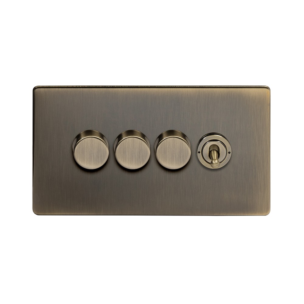 Soho Lighting Antique Brass 4 Gang Switch with 3 Dimmers (3 x 150W LED Dimmer 1 x 20A 2 Way Toggle)