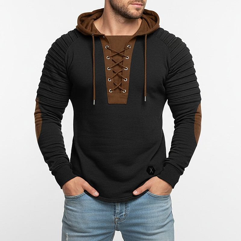 Men's T Shirt Tee Top Long Sleeve Shirt Shirts With Elbow Patches Long Sleeve Hooded Spring Fall Color Block Slim Pleated Fashion Designer Basic Lace up Patchwork Vacation Street Going out Black