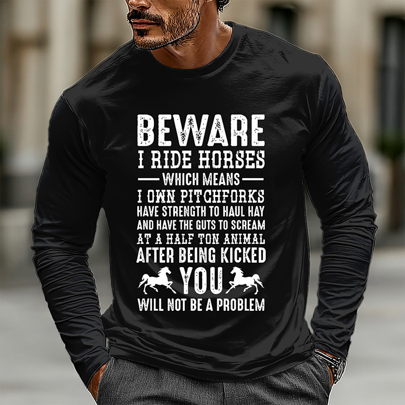 Mens Funny Horse Riding T Shirt Beware I Ride Horses I Own Pitchforks Quote Long Sleeve Graphic Tees Novelty Rancher Cowboy Gift For Him Clothing Apparel S M L XL XXL XXXL