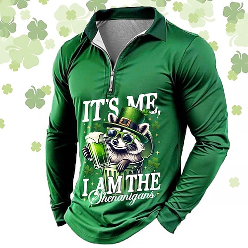 St. Patrick's Day Herren Kleeblatt Text Poloshirts mit Reißverschluss Langarm Polo-Shirts Revers Lässig Outdoor Festival-Outfit 3D-Druck Frühling Herbst Schwarz Hellgrün Grün