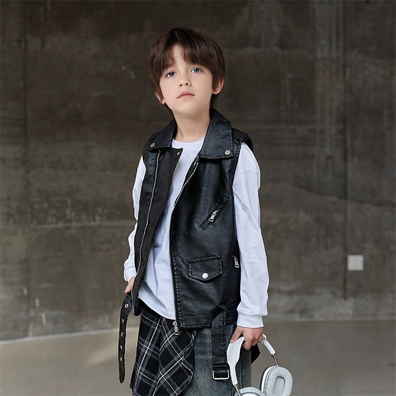 Kid's Boys' Black Leather Jacket Vest Jacket Outerwear Plain Long Sleeve Zip Up Waterproof Windproof Coat Daily Fashion Casual Black Spring Fall 4-12 Years