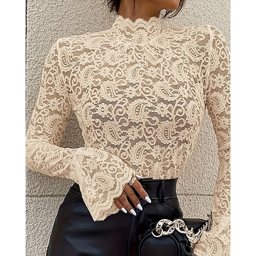 Per donna Blusa Top in chiffon Top in pizzo Semplice Elegante Sexy Manica Lunga Collo Alto Top Regolari Ferie Uscire Pizzo Blu Nero Bianco Rosa Vino Estate Primavera