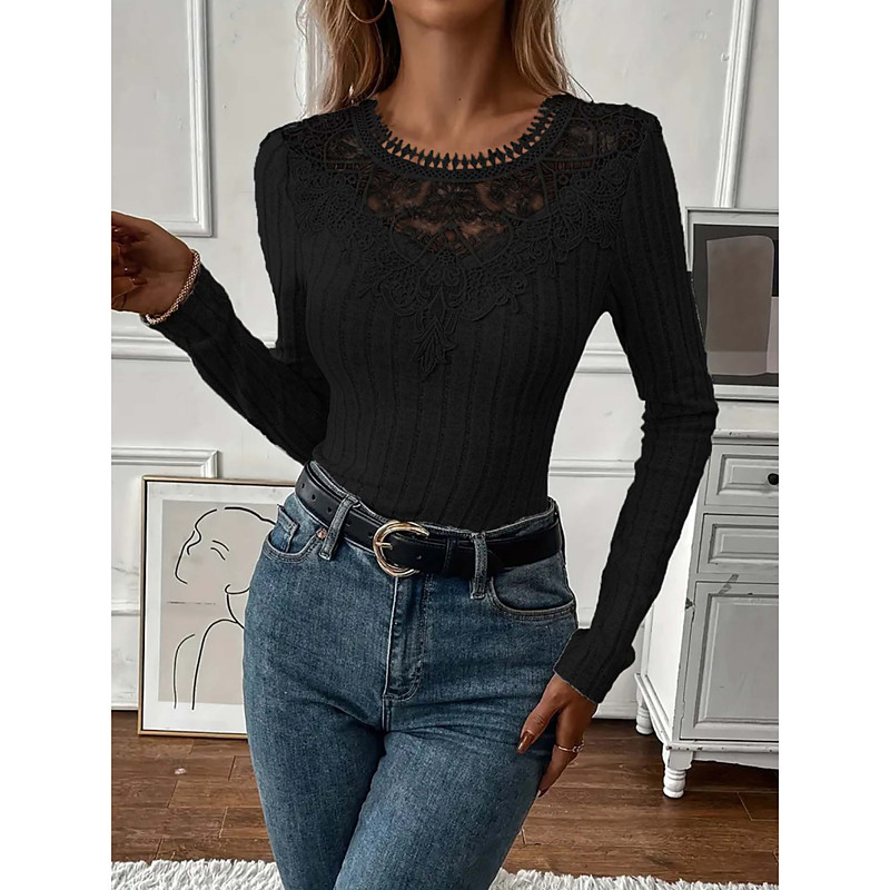 Women's Blouse Solid Color Elegant Stylish Basic Long Sleeve Crew Neck Regular Tops Daily Lace Patchwork Black White Pink Purple Gray Spring Fall Winter