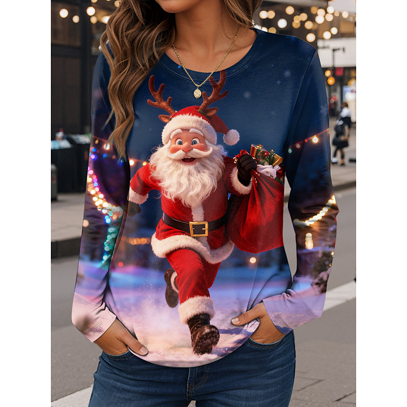 Christmas Women's T Shirt Graphic Claus Vintage Fashion Stylish Long Sleeve Crew Neck Regular Tops Daily Weekend Print Red Blue Dusty Blue Fall Winter