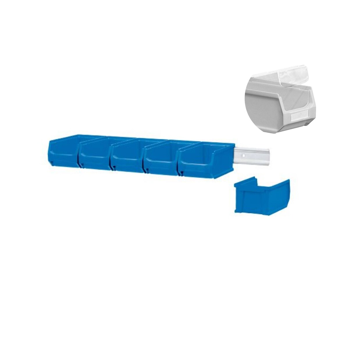 PROREGAL Wandleiste mit 6x Blaue Sichtlagerbox 2.0 mit Abdeckung | HxBxT 7,6x60,5x17,6cm | Wandhalterung, Kleinteileaufbewahrunghalterung