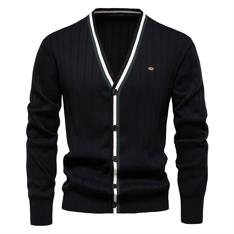 Men's Cardigan Sweater Knit Button Up with White Trim Striped Deep V Knitwear Elegant School Training Clothing Apparel Bishop Sleeve Fall Winter Black Navy Blue S M L