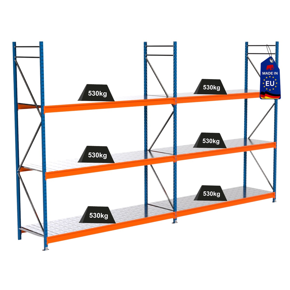 PROREGAL Industrie Schwerlastregal MAXIMUS PRO, Komplettregal, HxBxT 300x500x80cm, 3 Ebenen, Stahlplatten-Fachboden, Fachlast 530 kg, Blau/Orange