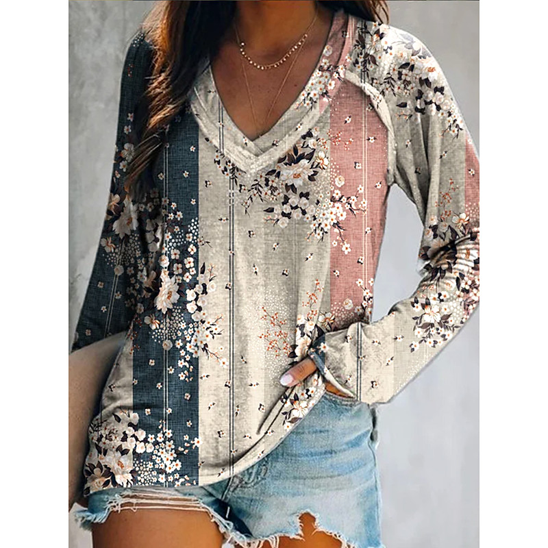 Women's T shirt Long Sleeve V Neck Long Sleeve Graphic Casual Floral Geometric Vintage Western Regular Tops Daily Weekend Vacation Wear Print Yellow Wine Dusty Rose Spring Fall Prefall