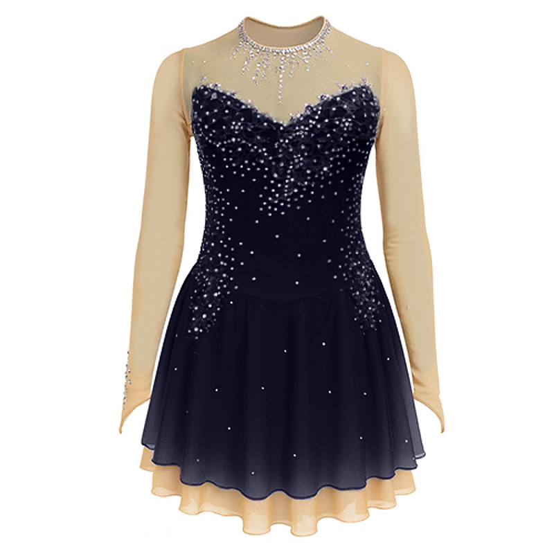 Figure Skating Dress Women's Girls' Ice Skating Dress Yellow Dark Purple Dusty Rose Patchwork Flower Mesh Spandex High Elasticity Competition Skating Wear Handmade Floral Long Sleeve Ice Skating