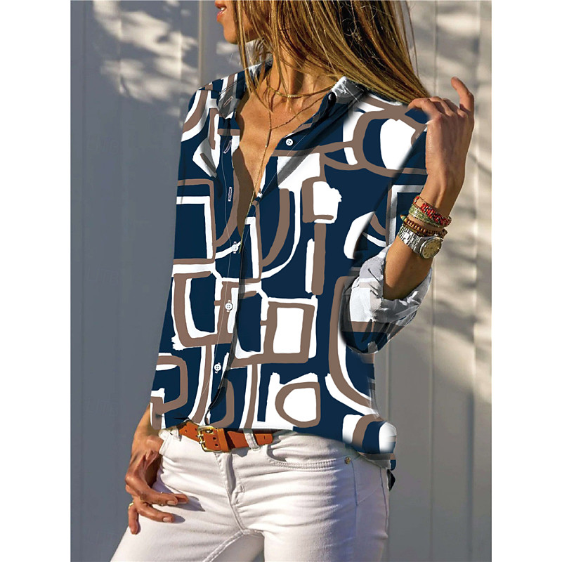Women's Shirt Button Down Tunic Shirt Collar Long Sleeve Geometric Casual Regular Tops Work Daily s Print Navy Blue Spring Fall Winter