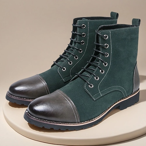 stivali da uomo in pelle scamosciata verde con lacci e suola a contrasto: calzature robuste ed eleganti per avventure all'aria aperta, escursioni e abbigliamento casual