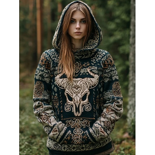 Felpa con cappuccio da donna, stile vichingo, stile boho, grafica, geometrica, stile occidentale, etnico, casual, a maniche lunghe, con cappuccio, stile normale, stile street casual, patchwork,