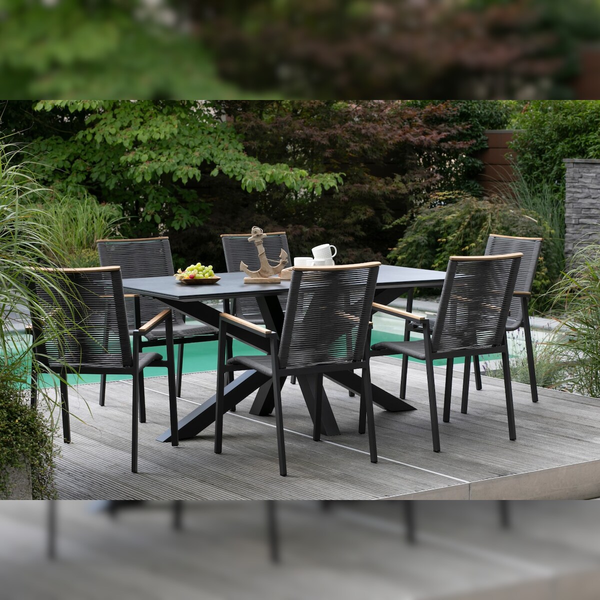 Mr. Deko Gartenmöbelset Tisch Malaga eckig, 6er Set Dining Stapelsessel Alicante Rope