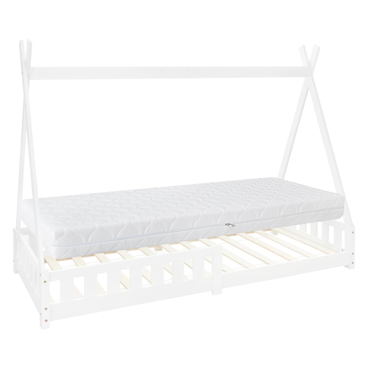 ML-Design Kinderbett Tipi 90x200 cm Weiß mit Matratze H:16 cm, Rausfallschutz & Lattenrost, Indianer Hausbett mit Zaun aus Kiefernholz, Bodenbett