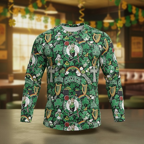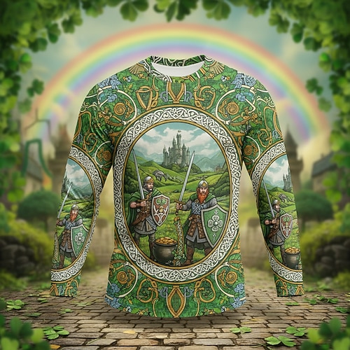 T-shirt a maniche lunghe per uomo per il giorno di San Patrizio, maglietta grafica con trifoglio irlandese fortunato, scollo rotondo con stampa 3D, top per il giorno di San Patrizio