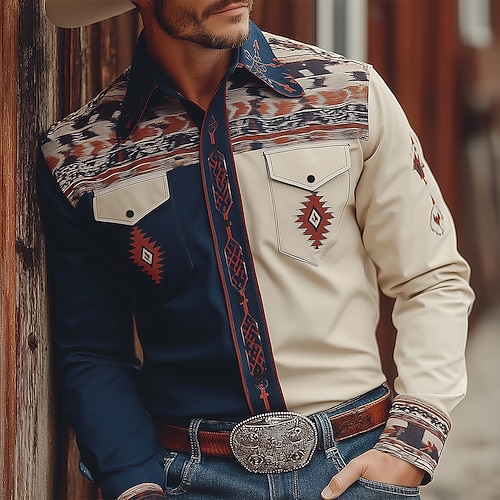Per uomo Geometrico Azteco Etnico Camicia Camicia Western Camicia da cowboy Manica Lunga Vintage Retrò All'aperto Casuale Abbigliamento da lavoro Primavera Autunno Collo ripiegato Due tasche