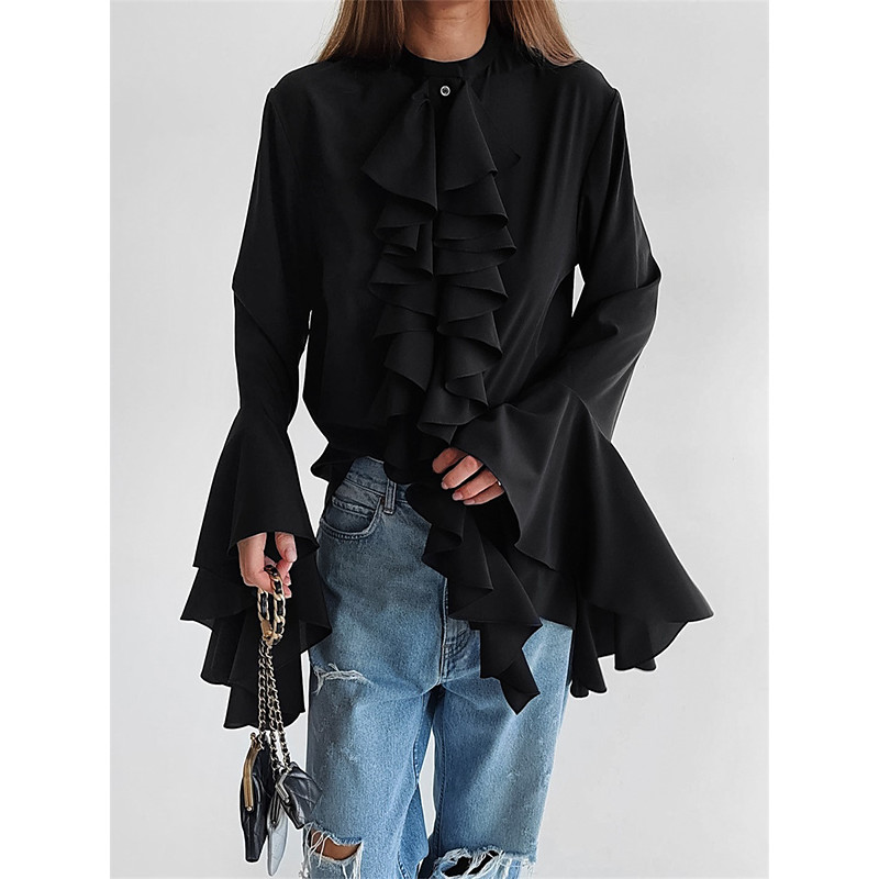 Women's Shirt Blouse Solid Color Elegant Stylish Casual Long Sleeve Crew Neck Regular Tops Work Daily Holiday Ruffle Black White Spring Fall Winter