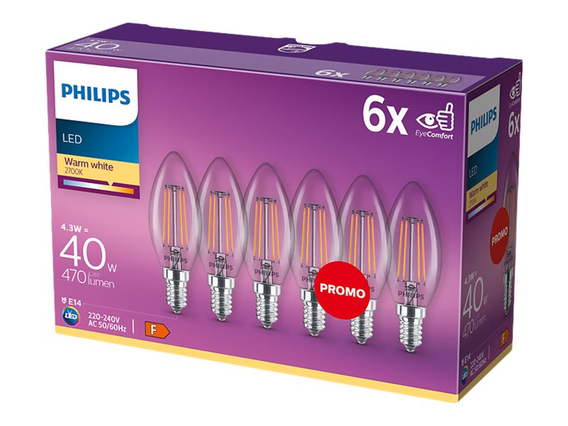 Philips - LED-filamentlyspære - form: B35 - klar finish - E14 - 4 W (ekvivalent 40 W) - klasse F - varmt hvitt lys - 2700 K (en pakke 6)