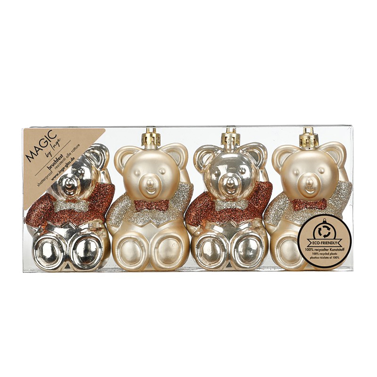Inges Magic & Goodz 4 Christbaumschmuck Teddybären 8cm Kunststoff Christbaumkugeln Glitzer Weihnachtskugeln Weihnachtsbaumkugeln Weihnachtsdeko Uni Bruchsicher Champagner