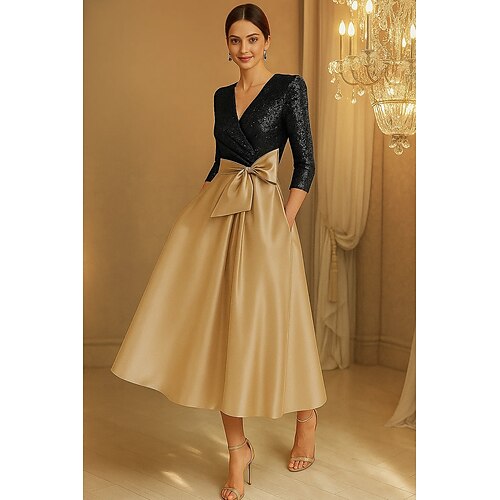 Linea ad A Lunghezza Tè Abiti da Cocktail Abiti da festa Elegante Manica 3/4 Scollo a V Festa in giardino Matrimonio Raso Elasticizzato Con Paillettes con Fiocco/Fiocchi