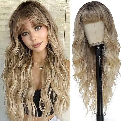 blonde Damenperücken gewellter Mittelteil Perücke mit Pony lange gewellte hitzebeständige Kunsthaarperücken