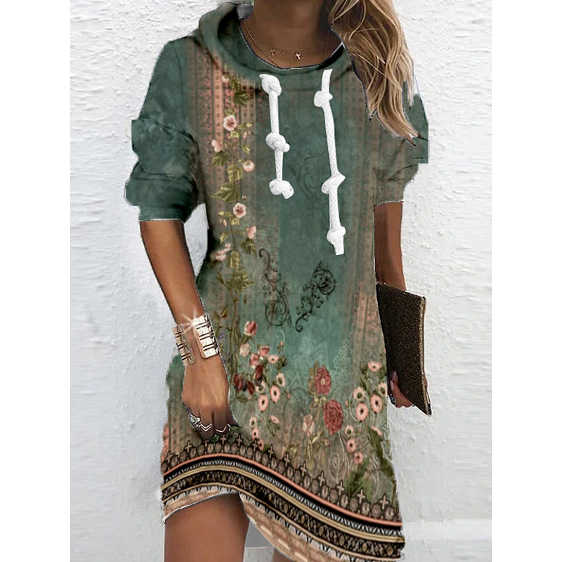 Women's Hoodie Dress Mini Dress Sheath Dress Shift Dress Party Casual Boho Outdoor Home Sport Regular Fit Floral Graphic Long Sleeve Hooded Blue Green Spring Fall Winter