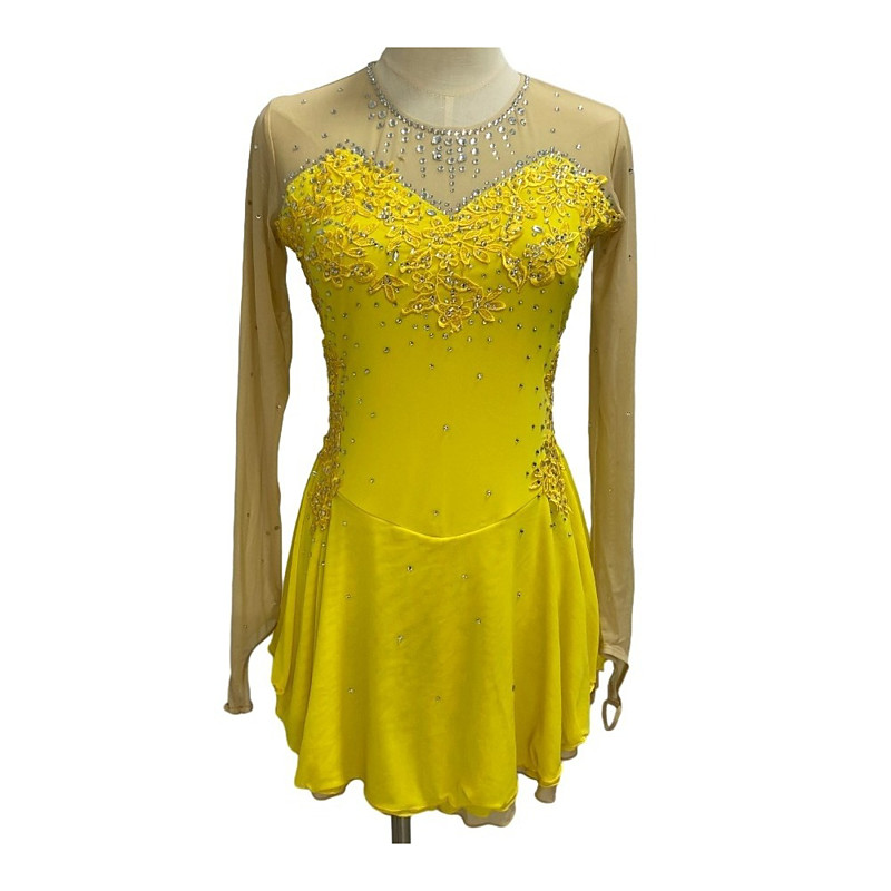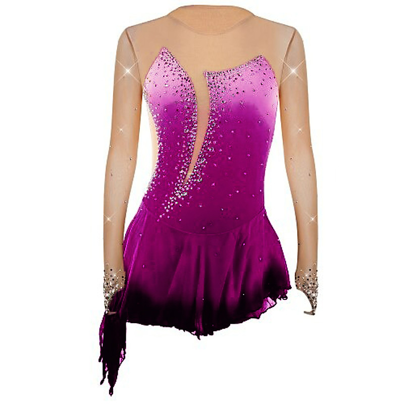 Figure Skating Dress Women's Girls' Ice Skating Dress Outfits Violet Yellow Dusty Rose Asymmetric Hem Mesh Spandex Competition Skating Wear Fashion Long Sleeve Ice Skating Figure Skating