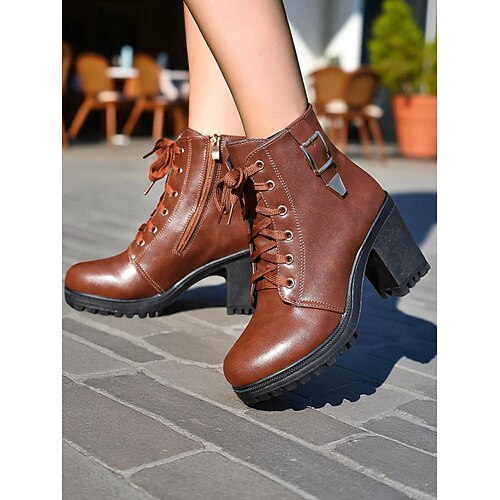 stivaletti da donna con tacco grosso e lacci marroni – stile combat in similpelle con cerniera laterale e fibbia, ideali per outfit autunnali, attività all'aperto e streetwear casual