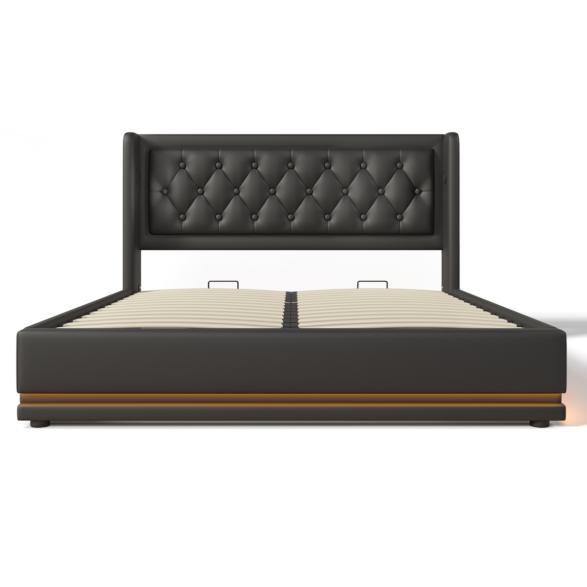 Merax Polsterbett Doppelbett 160*200 cm, Hydraulisches Stauraumbett, mit USB Typ-C Ladefunktion, LED-Funktion(Ohne Matratze), PU, Schwarz