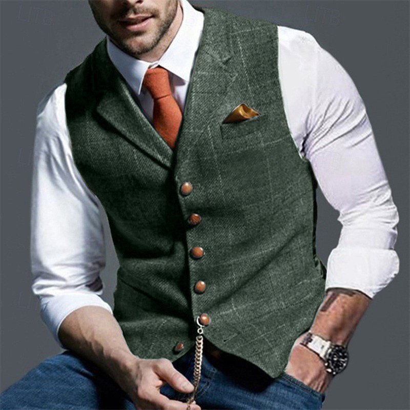 Men's Vest Tweed Vest Waistcoat Vintage Fashion Spring Fall Buttons Wool Blend Comfortable Plain Single Breasted V Neck Regular Fit Deep Green Navy Dark Gray Light Grey Vest