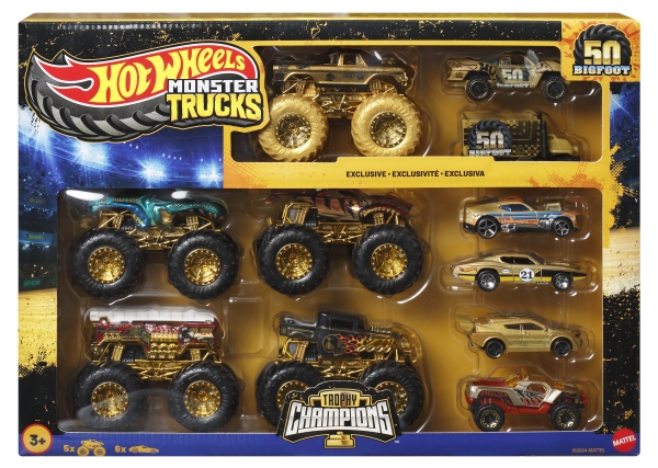 Hot Wheels Monster Trucks Trophy Champions Collection, 5 1:64 Scale Toy Trucks & 6 Die-Cast Cars, Vehicle set, 3 yr(s), Plastic, Metal, Gold, Multicolour