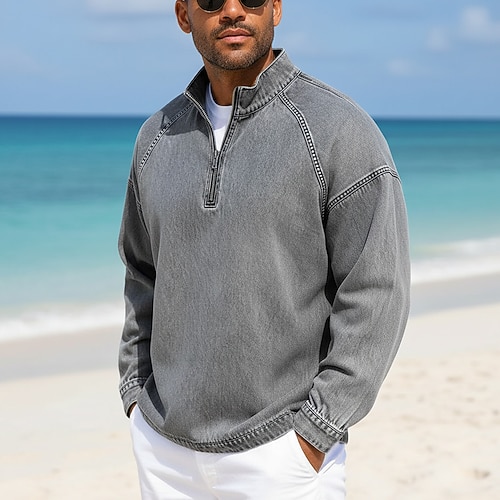 Per uomo Camicia 100% cotone lavaggio acido Maglietta Manica Lunga Collo alla coreana Primavera Autunno Autunno Inverno Semplice Vintage Streetwear Casual Con zip Base Casuale Casa Streetwear Blu
