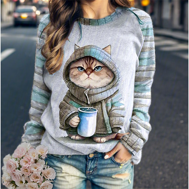 Women's Pullover Graphic Cat Casual Long Sleeve Crew Neck Regular Tops Casual Blue Pink Orange Green Spring Fall Winter