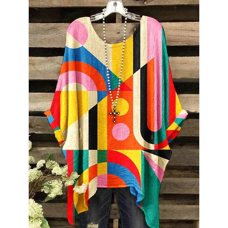 Women's Boho Shirt Graphic Geometric Elegant Bohemia Vintage Short Sleeve Batwing Sleeve Crew Neck Regular Tops Daily Holiday Beach Wear Print Denim Blue Light Brown Blue Orange Rainbow Summer Spring