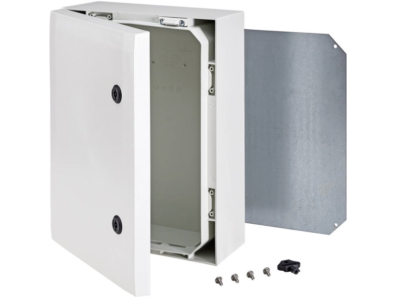 FIBOX Seinäkaappi ARCA, polykarbonaatti, harmaa ovi, 2 lukitusta, sarana pitkällä sivulla, KxSxK, 600x400x210mm, asennuslevyllä varustettuna