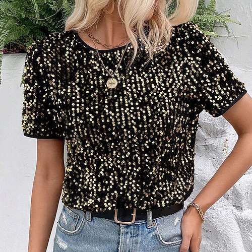 Per donna Maglietta Top estivi Tinta unica Elegante Vintage Classico Manica Corta Girocollo Top Regolari Quotidiano Uscire Weekend Paillettes Patchwork Oro rosa Nero e grigio Nero Bianco Rosa Estate