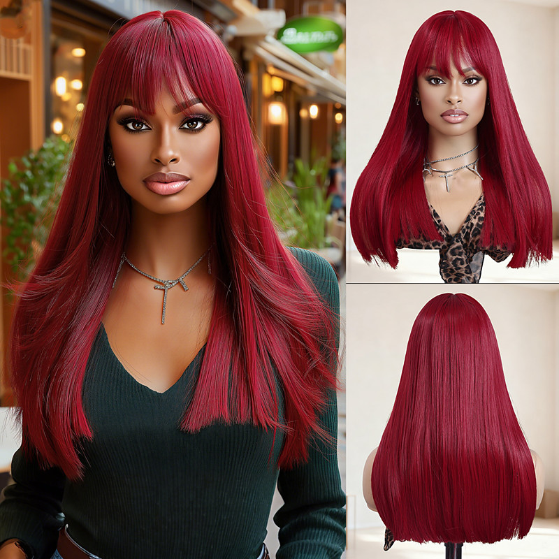 Red Wigs with Bangs Burgundy red Synthetic Long Straight Wig for Women Party and Cosplay Bright Red Wig