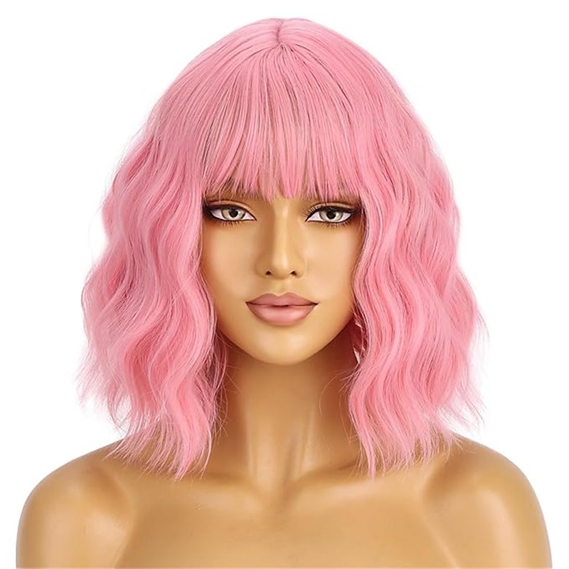 Short Wavy Pink Wig with Bangs Women Short Pink Bob Curly Wig with Bangs Pastel Wavy Wig for Women Shoulder Length Synthetic Wig Colorful Wigs Cosplay Wig Halloween Wigs