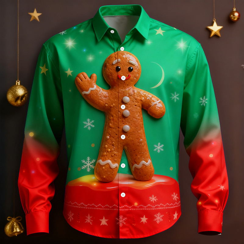 Christmas Men's Gradient Color funny christmas Gingerbread Man Shirt Button Up Shirt Long Sleeve Funny Outdoor Holiday Spring Fall Turndown 3D Print Collared Shirts Blue Green